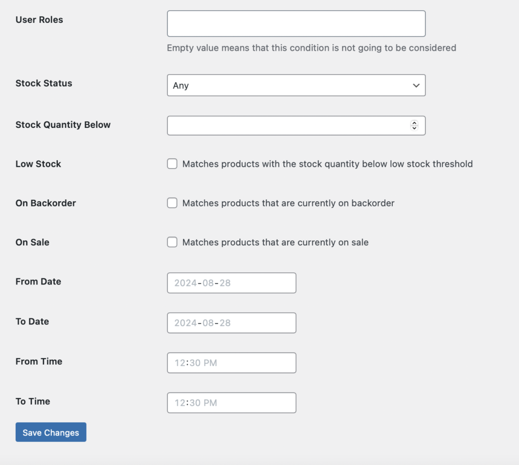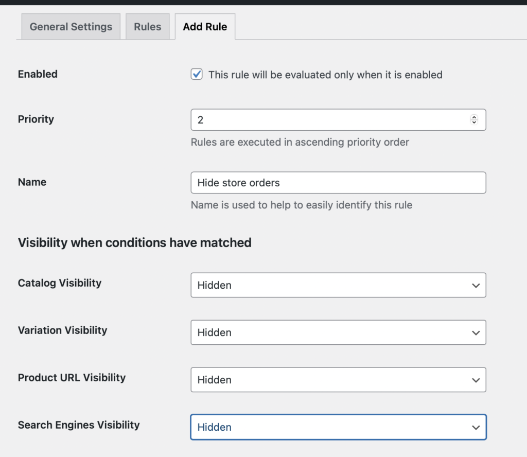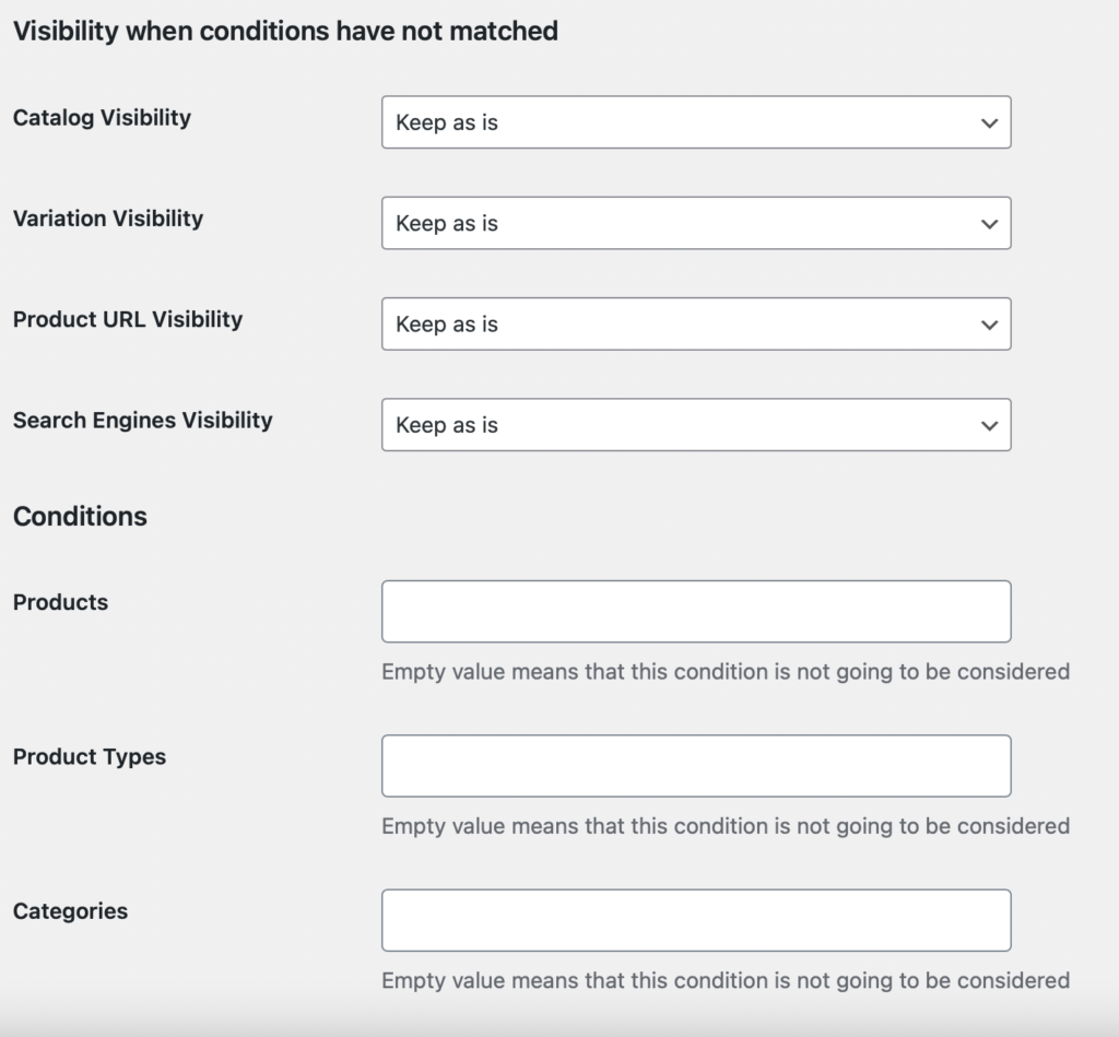 - Select “Hidden” if the condition matches, such as hidden in catalogue, variation, product URL, and search engine if the condition set up match