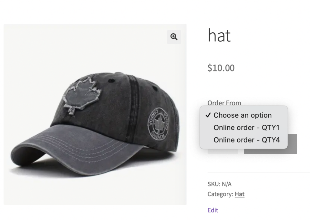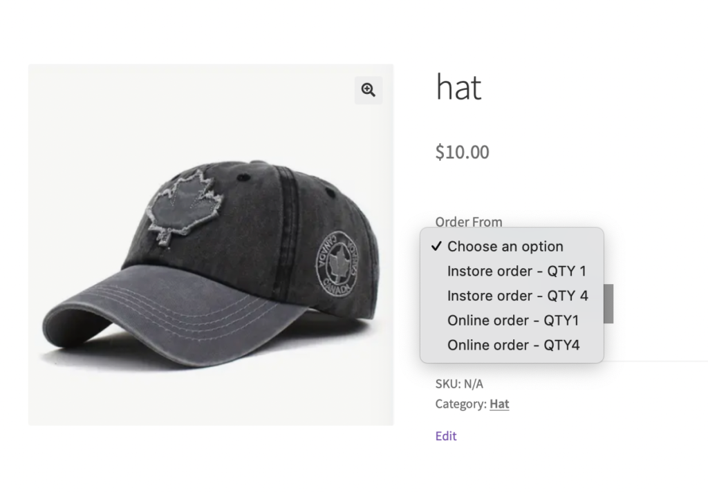- Now you will see the product “Hat” only has two variations for selection as screenshot below.