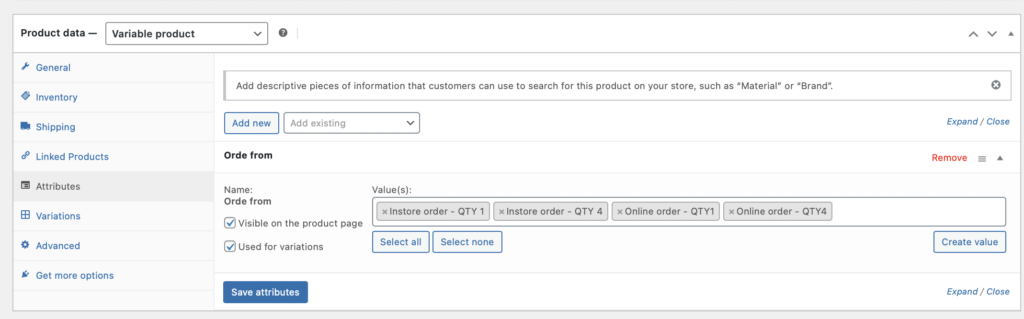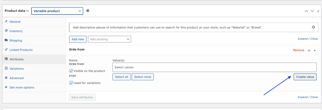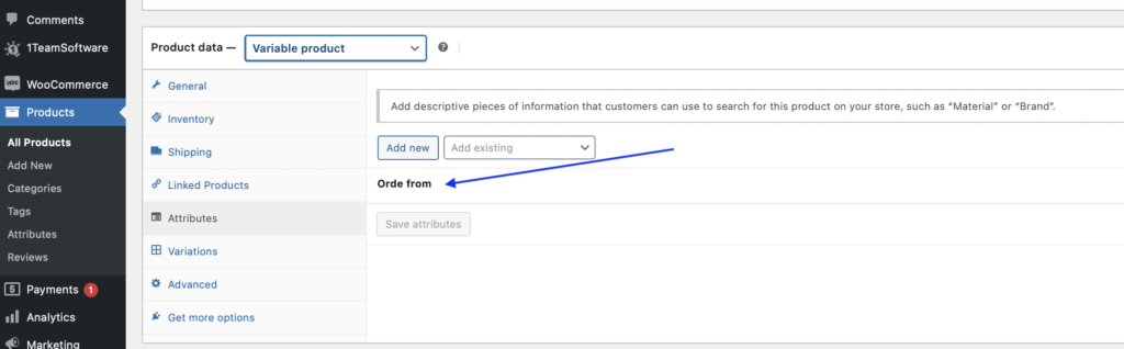 - Click on “Attributes” then you will see the attributes “Order from” which we created earlier.