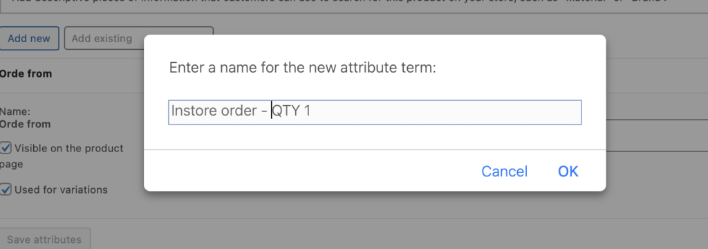 - Input the name for the new attributes, here we input “Order From” which we will use to identify the order is from in-store or online.