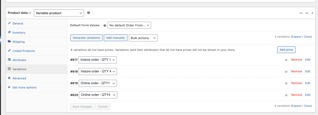 - Follow the same steps, and create 4 different value(variation) : Instore order -QTY1, Instore order – QTY 4, Online order – QTY1, Online order – QTY4.