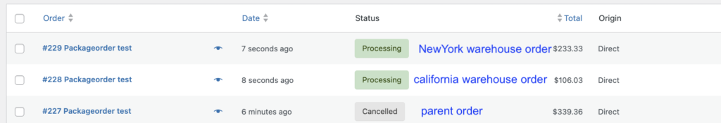 Below is a sample order where a customer purchases items from two different warehouses at the same time, one item is from the New York warehouse and another item is from the California warehouse. The store admin is using the Shipping Package for WooCommerce Plugin and the Package Order for WooCommerce Plugin to manage the order efficiently.