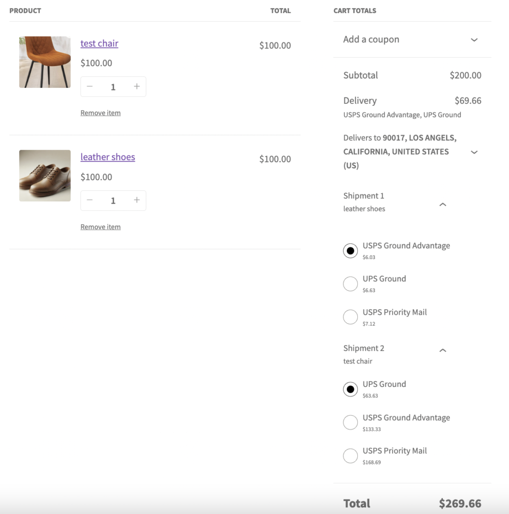 When products from multiple warehouses are included in a single order, the plugin separates them into individual packages in the cart by shipping class. Each package is listed with its respective warehouse, ensuring correct shipment fulfillment and proper live shipping rate calculations for each warehouse.
