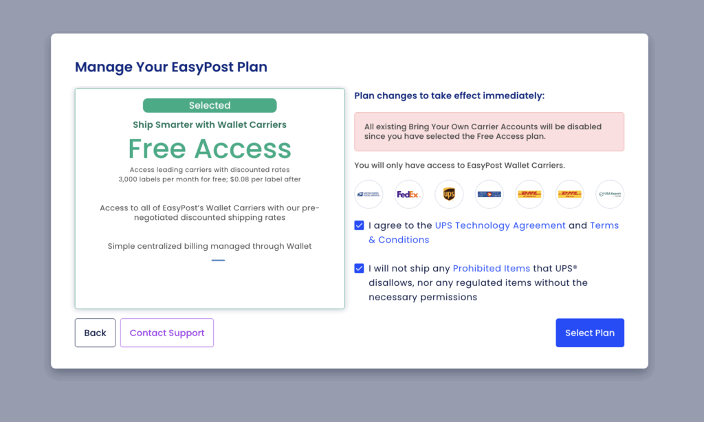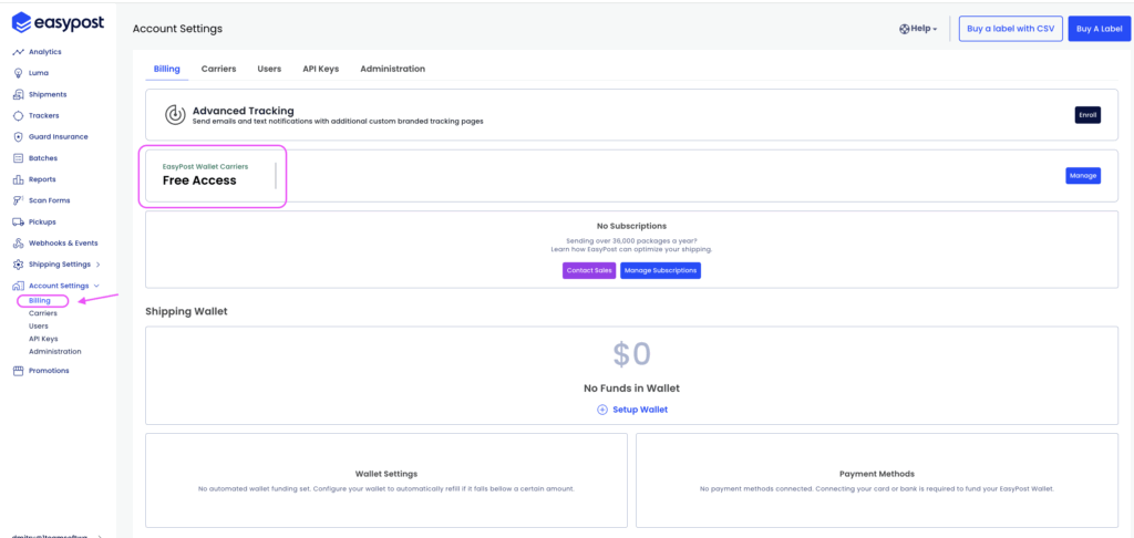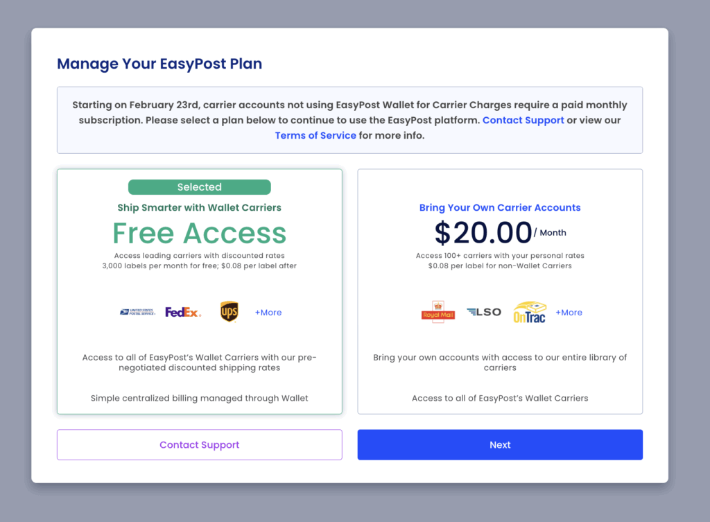 - Free Access Plan (using the EasyPost Wallet carrier), or