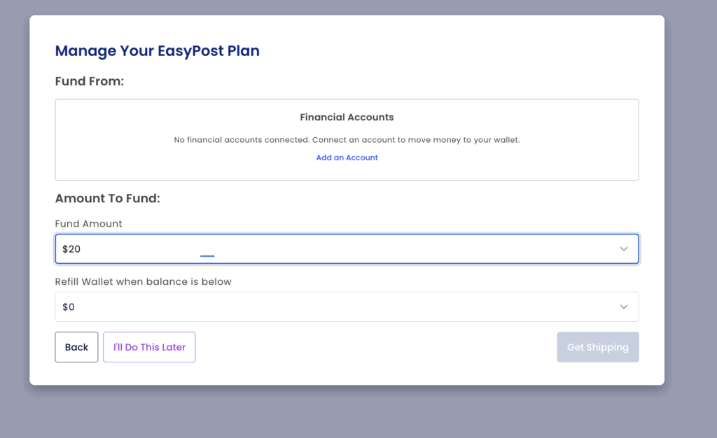 You will then be taken to a page where you can add funds to your EasyPost account.