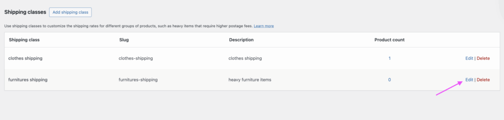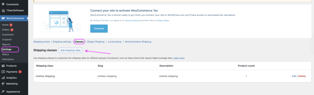 - Go to: WooCommerce > Settings > Shipping > Classes.