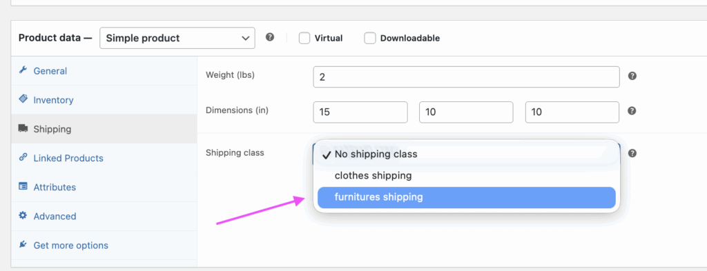 - Go to the Shipping tab, then choose the appropriate option from the Shipping class dropdown.