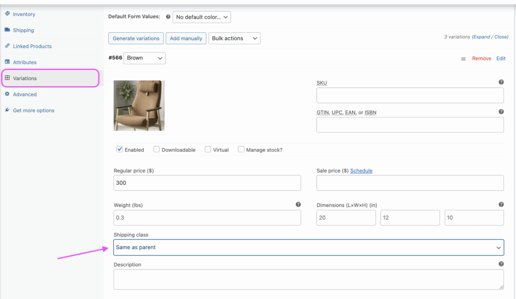 To do this, go to the Variations tab, open the variation you want to update, and select the suitable shipping class from the dropdown.