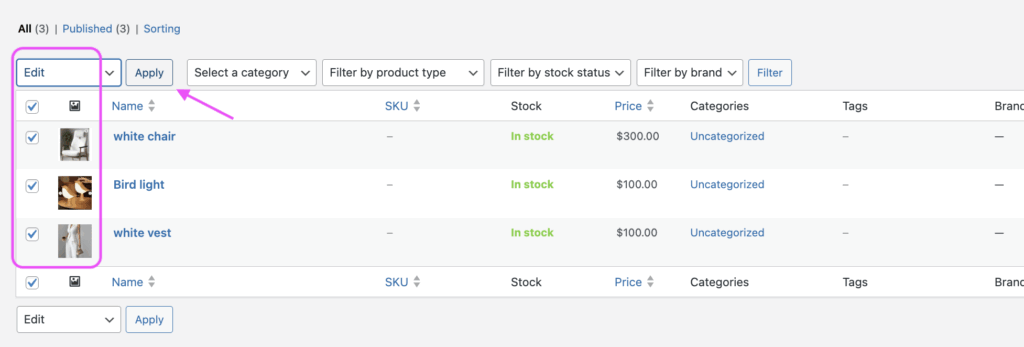 Check the boxes next to the products you want to update. From the Bulk actions dropdown, select Edit and click Apply.