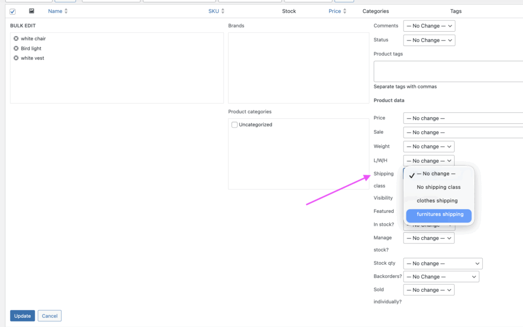 Look for the Shipping class dropdown, select the shipping class you want to apply to the selected products, and click Update.