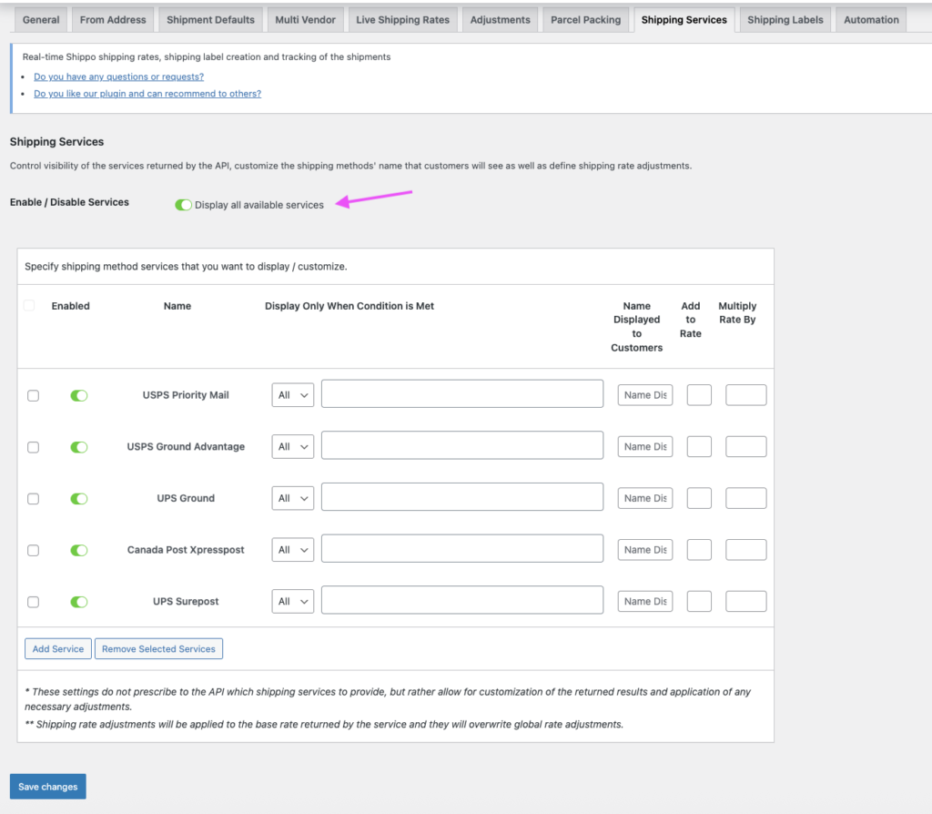- Enable the “Display all available shipping services” option.