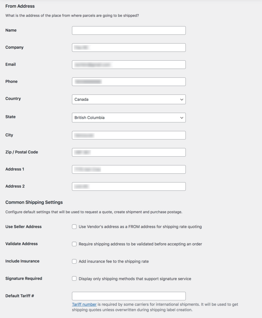 Use this section of the settings to enter the address you ship your orders from. It will be pre-populated with your WooCommerce store address. It is also used as Return To address, when parcel is bounced or if you will be printing return shipping labels.