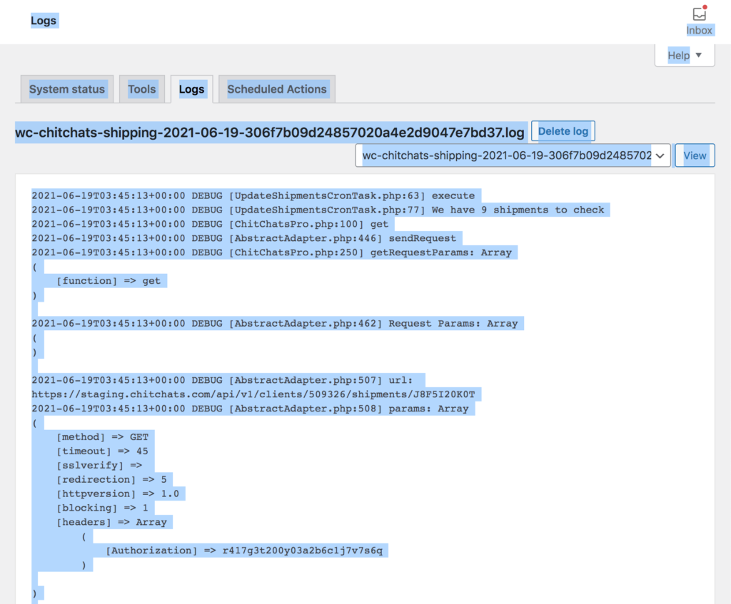 1. Go to WordPress Admin -> WooCommerce -> Status -> Logs.