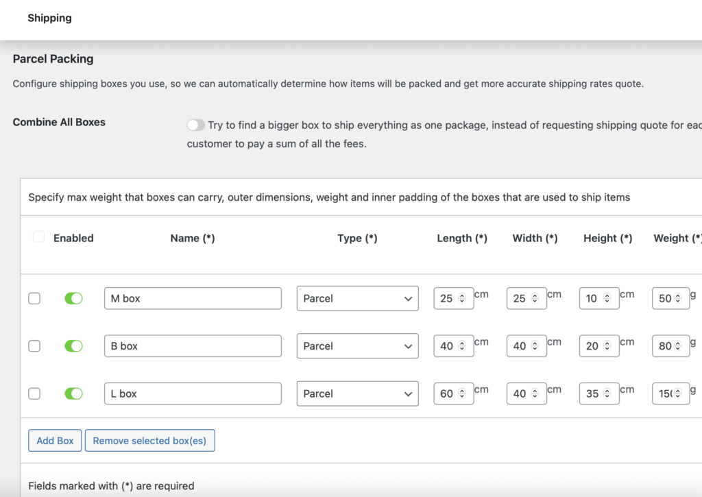 Go to the “Parcel packing” tab, and make sure you have configured the box you will use for shipping.