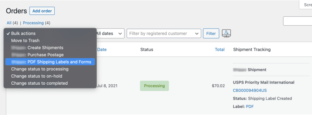 9. Choose PDF Shipping Labels and Forms bulk action and hit Apply button.