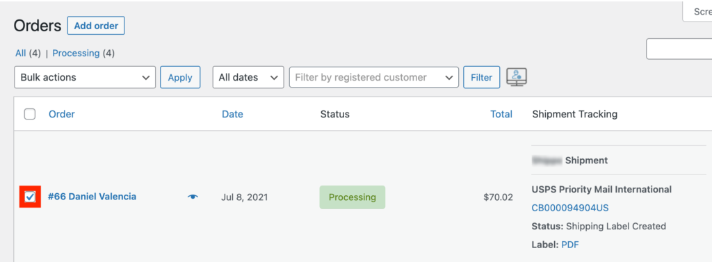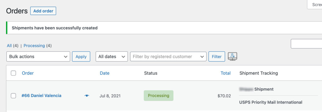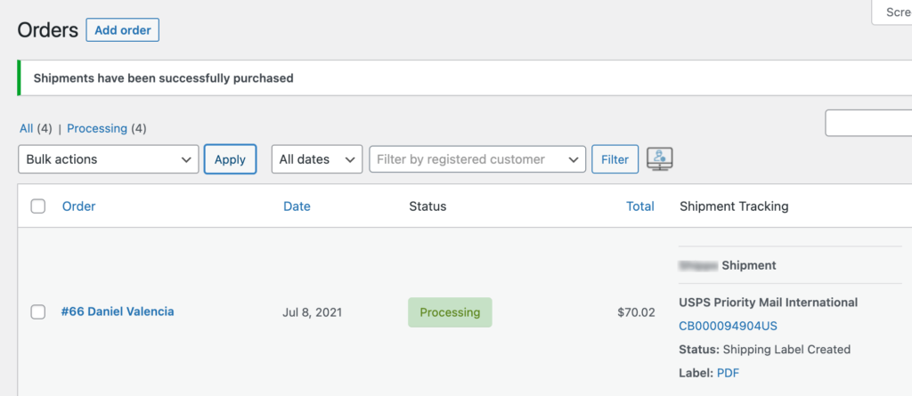 Then success message will be displayed along with the tracking information and a link to the shipping label displayed next to the processed orders.