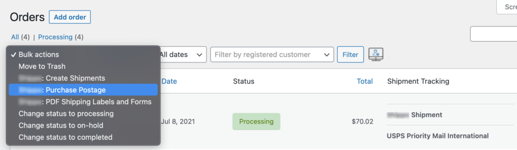 The number of steps you will have to take will vary depending on required steps enabled in Bulk Purchase Postage Workflow in the settings of the plugin. In this document we will take max number of steps needed to print bulk shipping labels.
