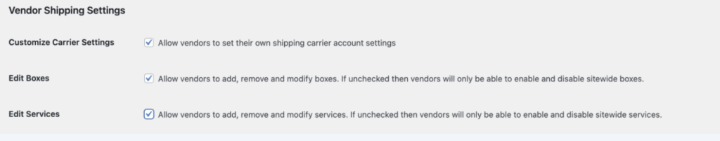 Enable all three features in this section to allow vendors to set up their preferred carriers, shipping services, and shipping boxes, ensuring their shipping settings align with their specific needs.