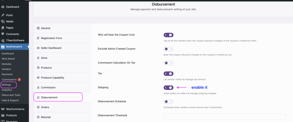 In the MultivendorX plugin, please go to Settings --> General --> Disbursement --> Shipping