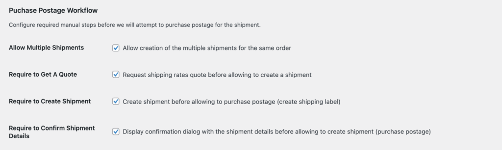 In this document we will go over postage purchase workflow settings of WooCommerce shipping plugin and talk about what they control and when you might want to change them.