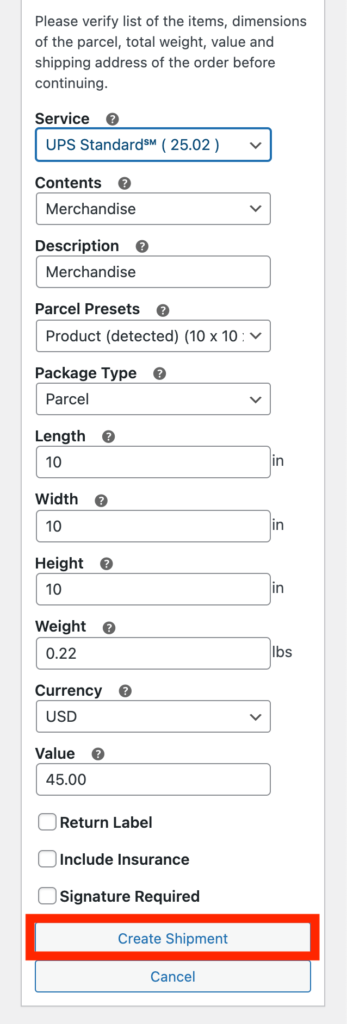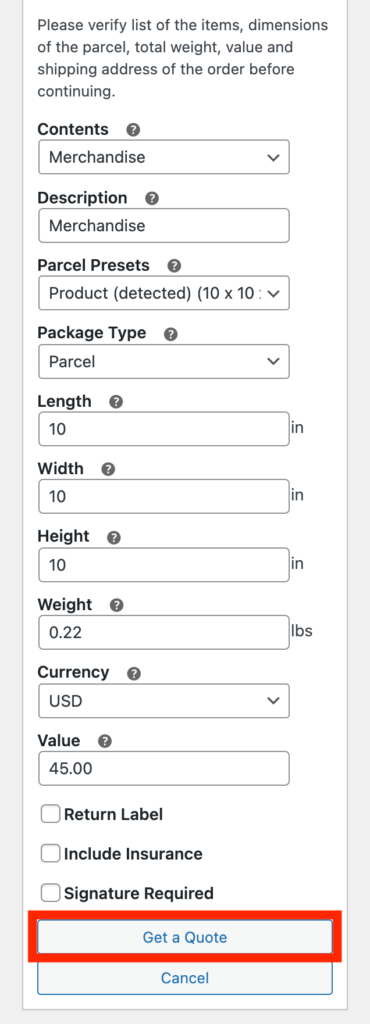 Example #2: If you sell thousands of products which can be ordered in different combinations and then shipped worldwide, then you might want to double check and possibly correct estimated dimensions and weight of the parcel as well as to get an accurate quote before you will print a shipping label.