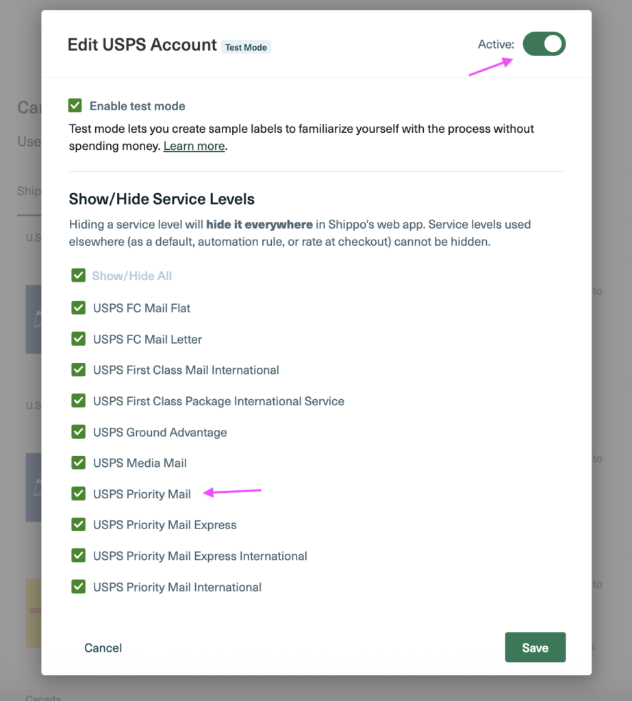 - Ensure you have switched the “Active” toggle to the right to enable the USPS account