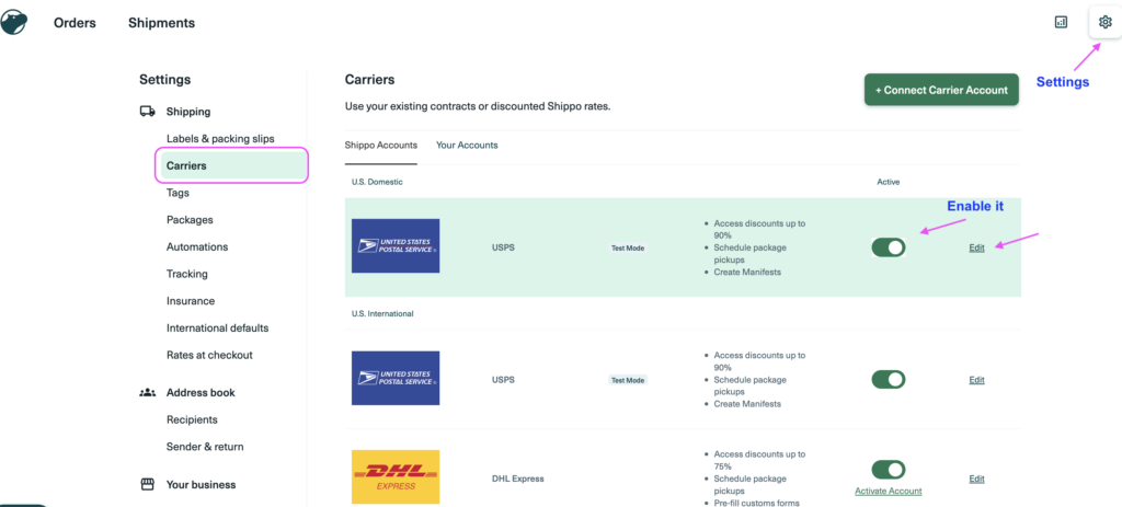 Step 1: Verify Shipping Service Activation in Your Shippo Account #