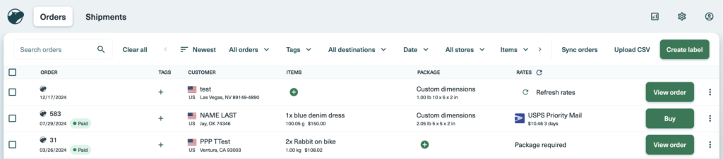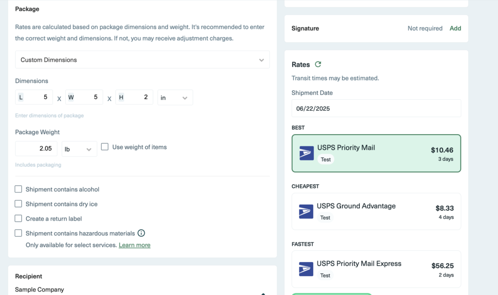 - Input the package dimension/weight in the Shippo dashboard to see if shipping rates are returned for USPS Priority Mail (or the service you’re testing).