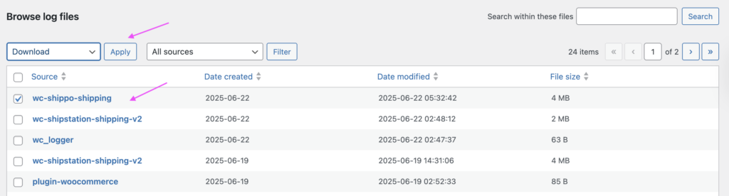 - Alternatively, you can navigate to WooCommerce → Status → Logs and find the latest debug log for your shipping plugin.