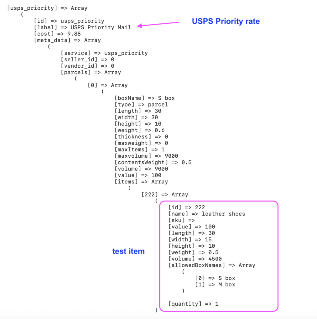 - Open the downloaded debug log file. Review the log to identify if your preferred shipping service, such as “USPS Priority Mail,” is returning a rate from the Shippo API for the rate request.