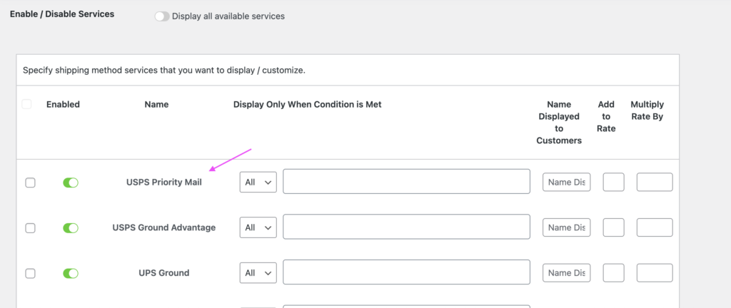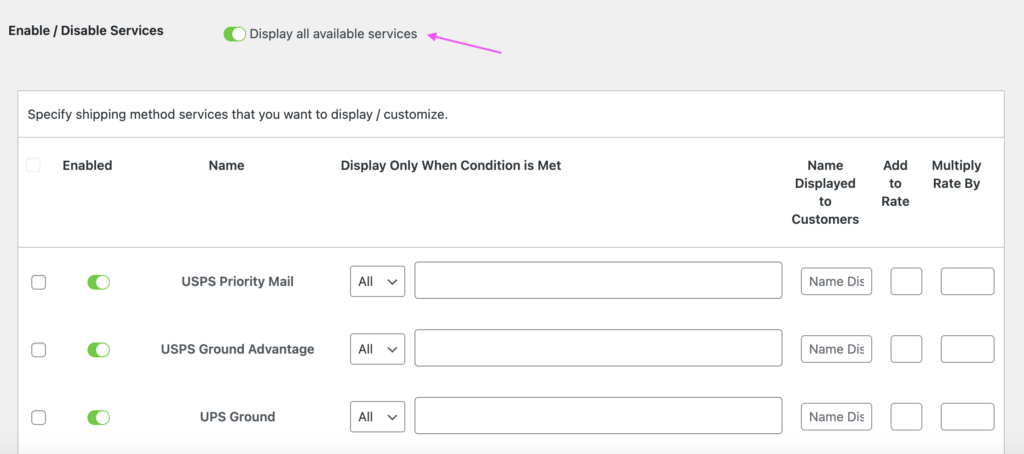 - Go back to the shipping plugin and navigate to the “Shipping Services” tab, enable “Display All available services” then save the settings.