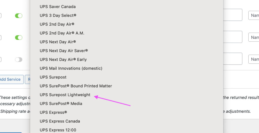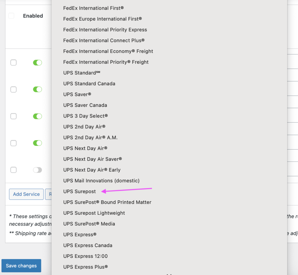 - Enable UPS SurePost services in the shipping services settings of the WooCommerce Shipping plugins