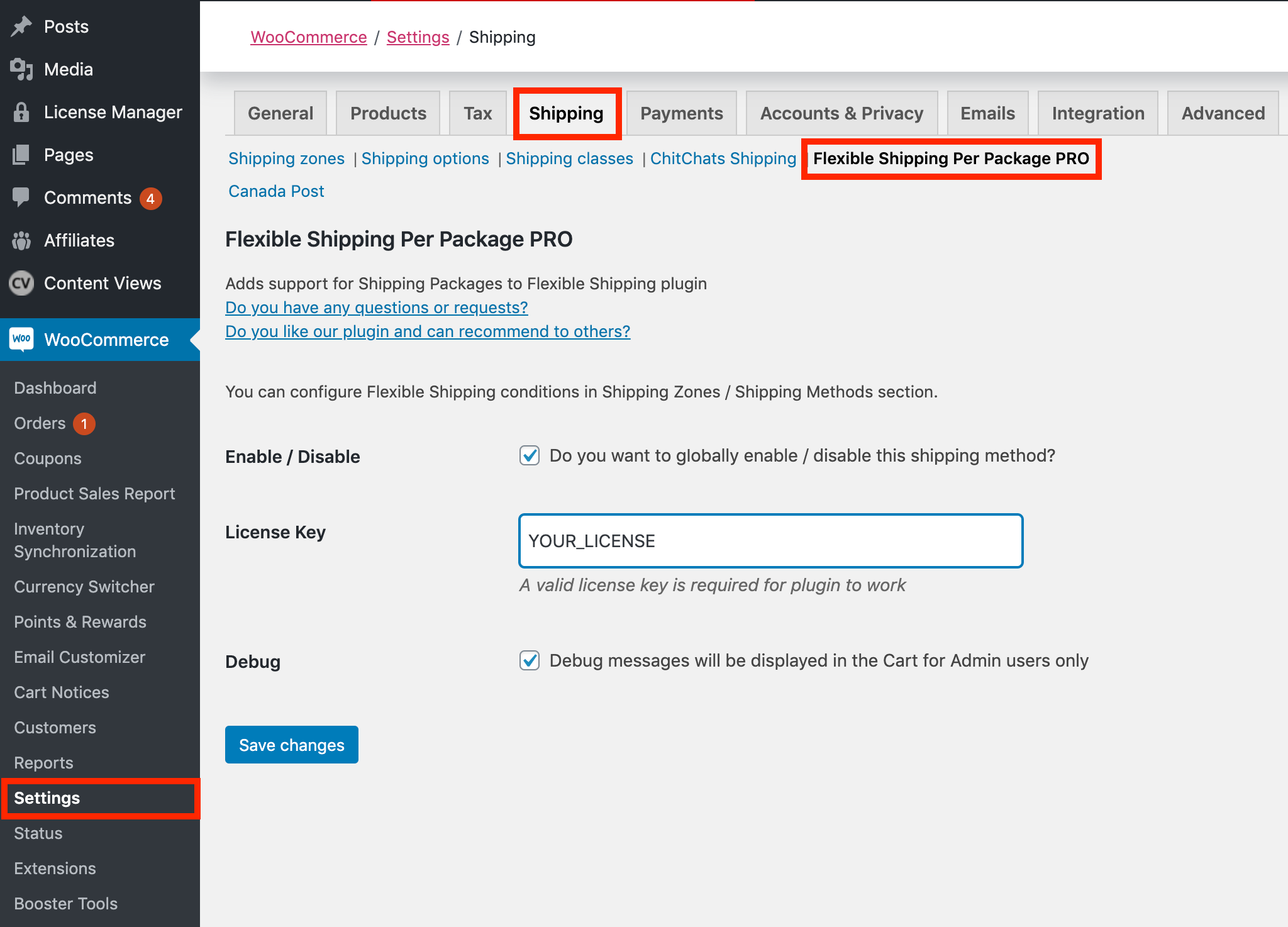Navigate to WooCommerce -> Settings -> Shipping -> Flexible Shipping Per Package PRO, then enter your license key and check Enabled