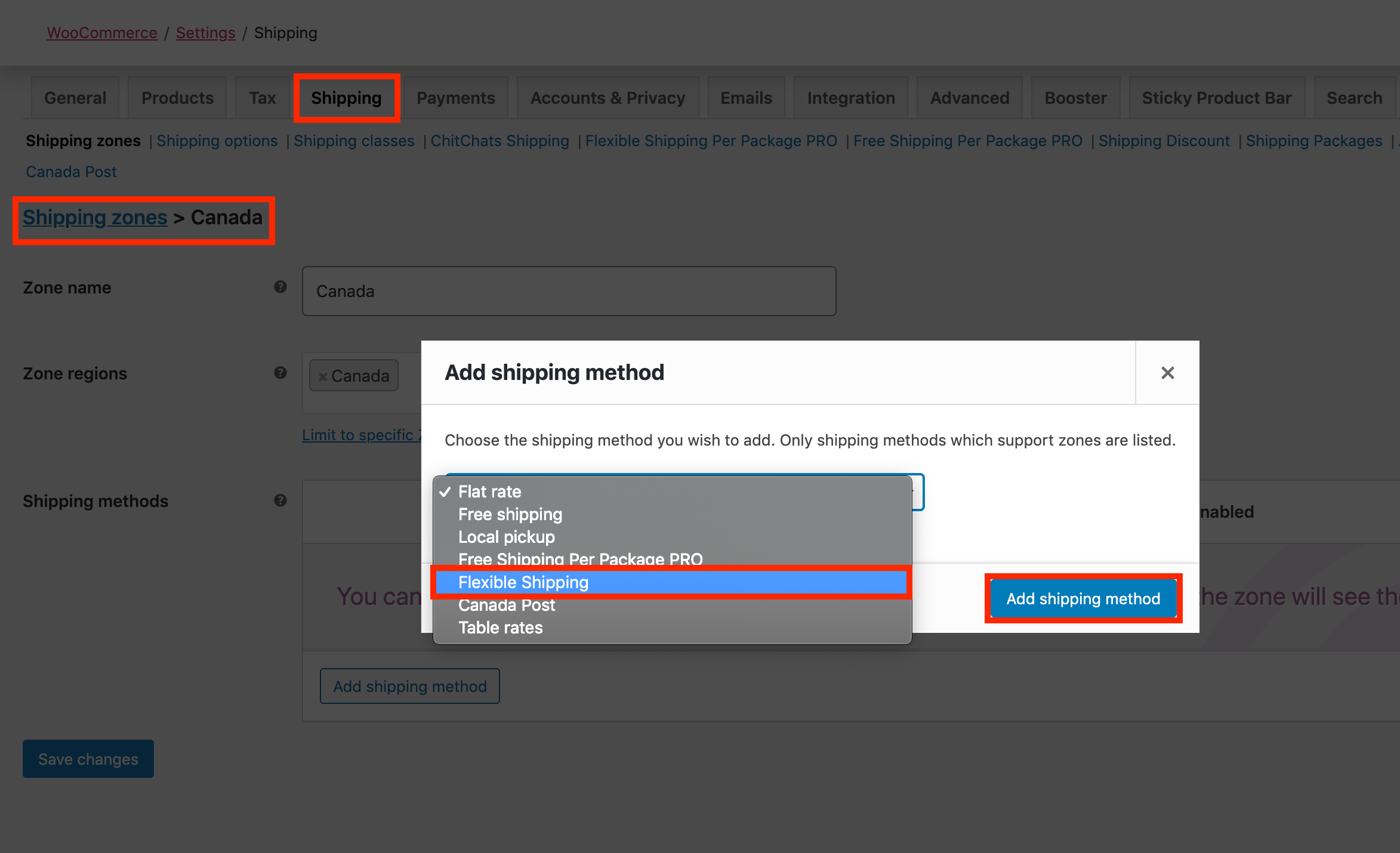 Navigate to WooCommerce -> Settings -> Shipping Zones and then Select Edit on any of the Shipping Zones, then hit Add Shipping Method inside of it and choose Flexible Shipping and hit Add Shipping Method