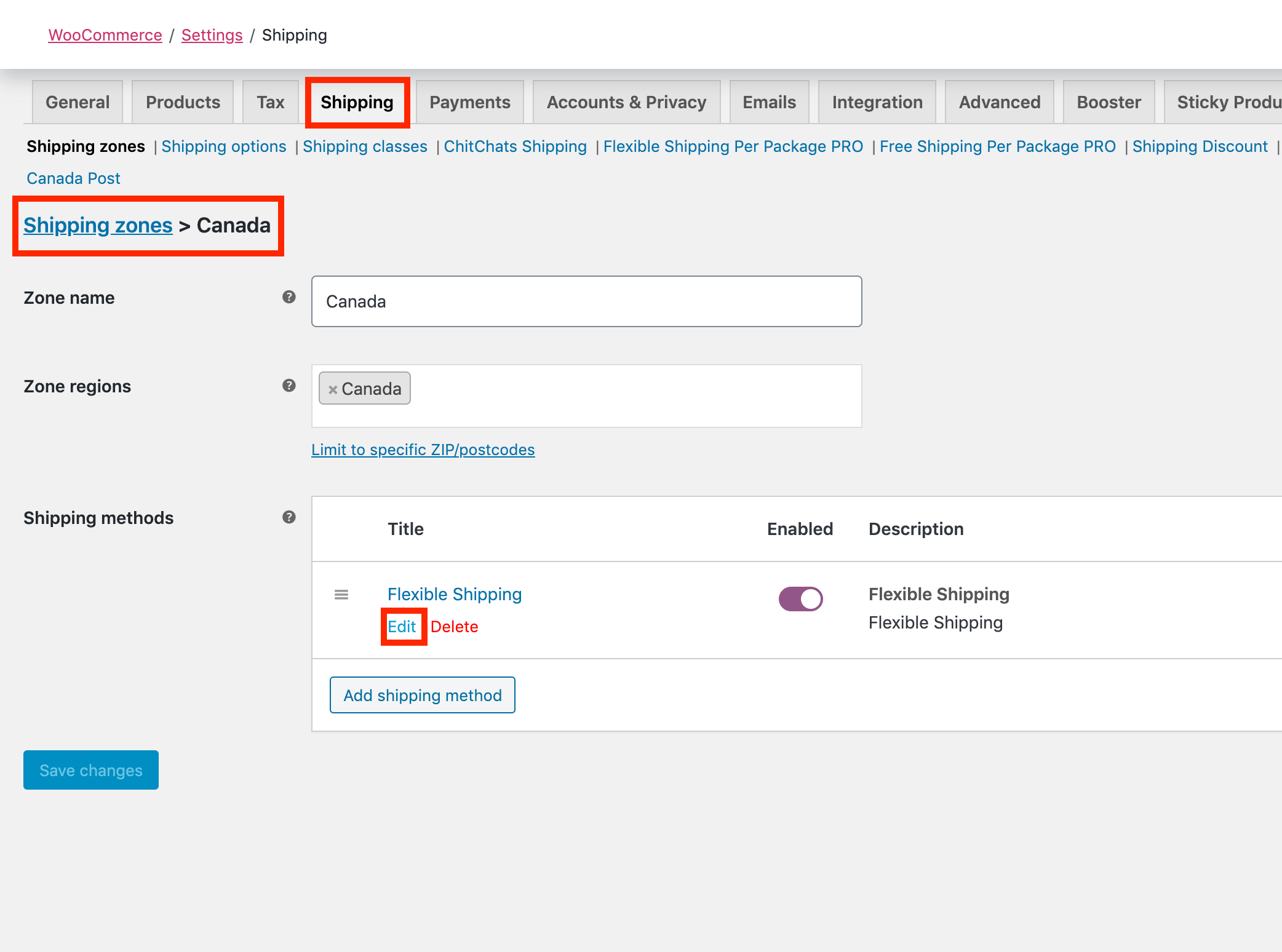 Navigate to WooCommerce -> Settings -> Shipping Zones and then click Edit on Flexible Shipping