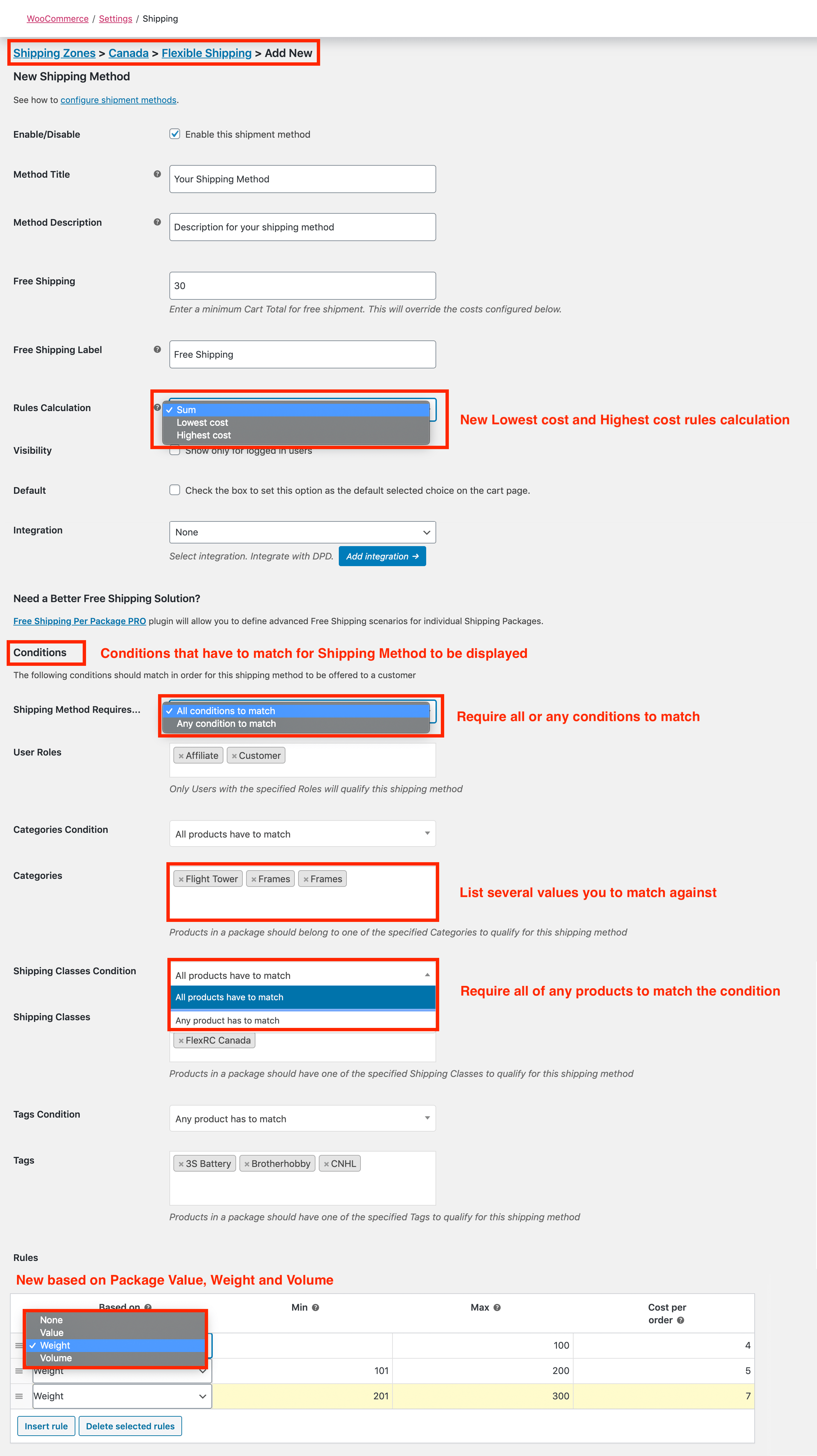 Flexible Shipping Per Package PRO plugin extends Flexible Shipping plugin by letting you to configure unlimited number of advanced Shipping Method conditions based on the User Role, Shipping Class, Category and Tag of the products as well as it changes Table Rate rules to be based on the Package value, weight or volume.
