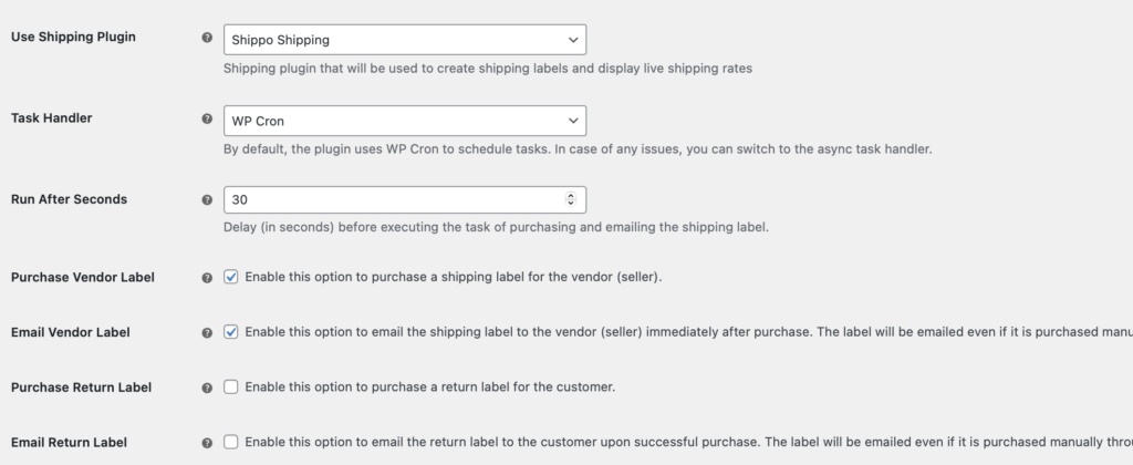 You would like to have shipping labels automatically purchased and sent to vendors via email. Additionally, you can set the interval to 30 seconds, enabling the plugin to perform these tasks approximately 30 seconds after receiving new orders.