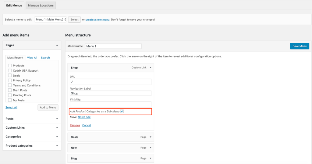 - Automatically adds sub-menu with Product Categories to any selected menu item.