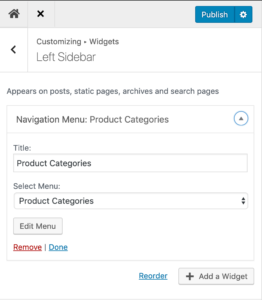 - Ability to add Navigation menu widget with Product Categories to any place on your website via Theme Customizer.