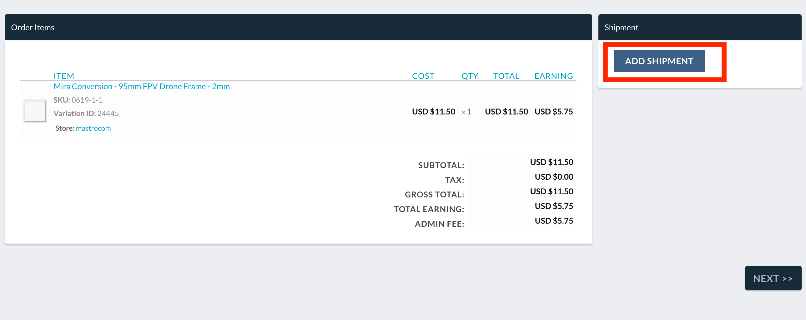 1. Vendor will choose an order that has to be shipped and hit Add Shipment on the right side of the order details