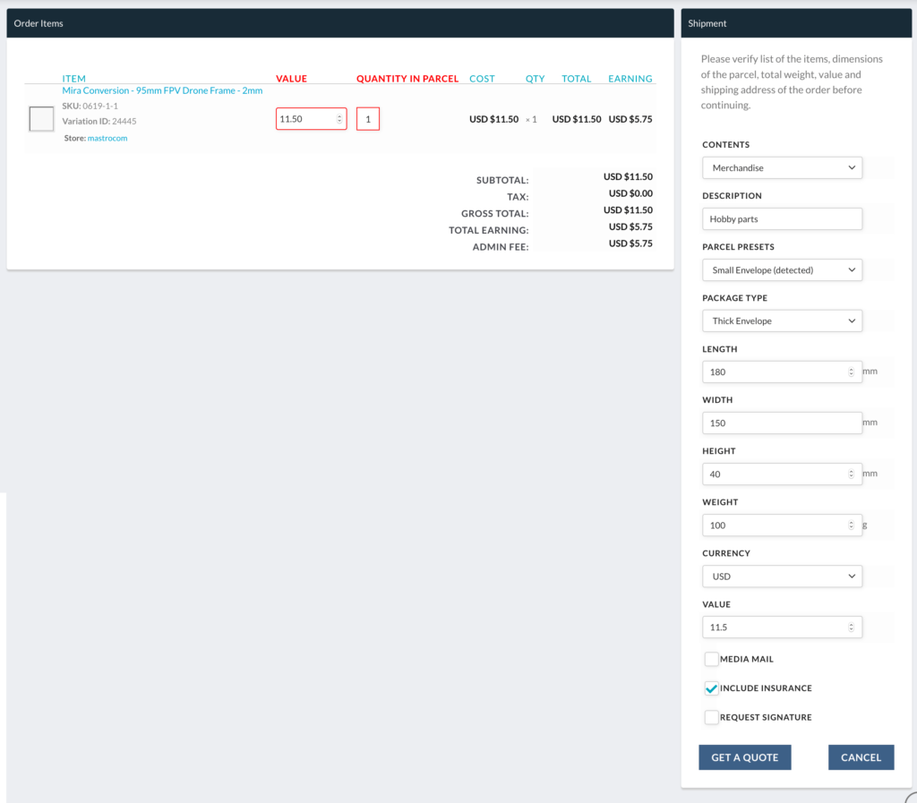 2. Vendor will fill in shipments details, such as weight, dimensions, package type and hit Get a Quote / Purchase button