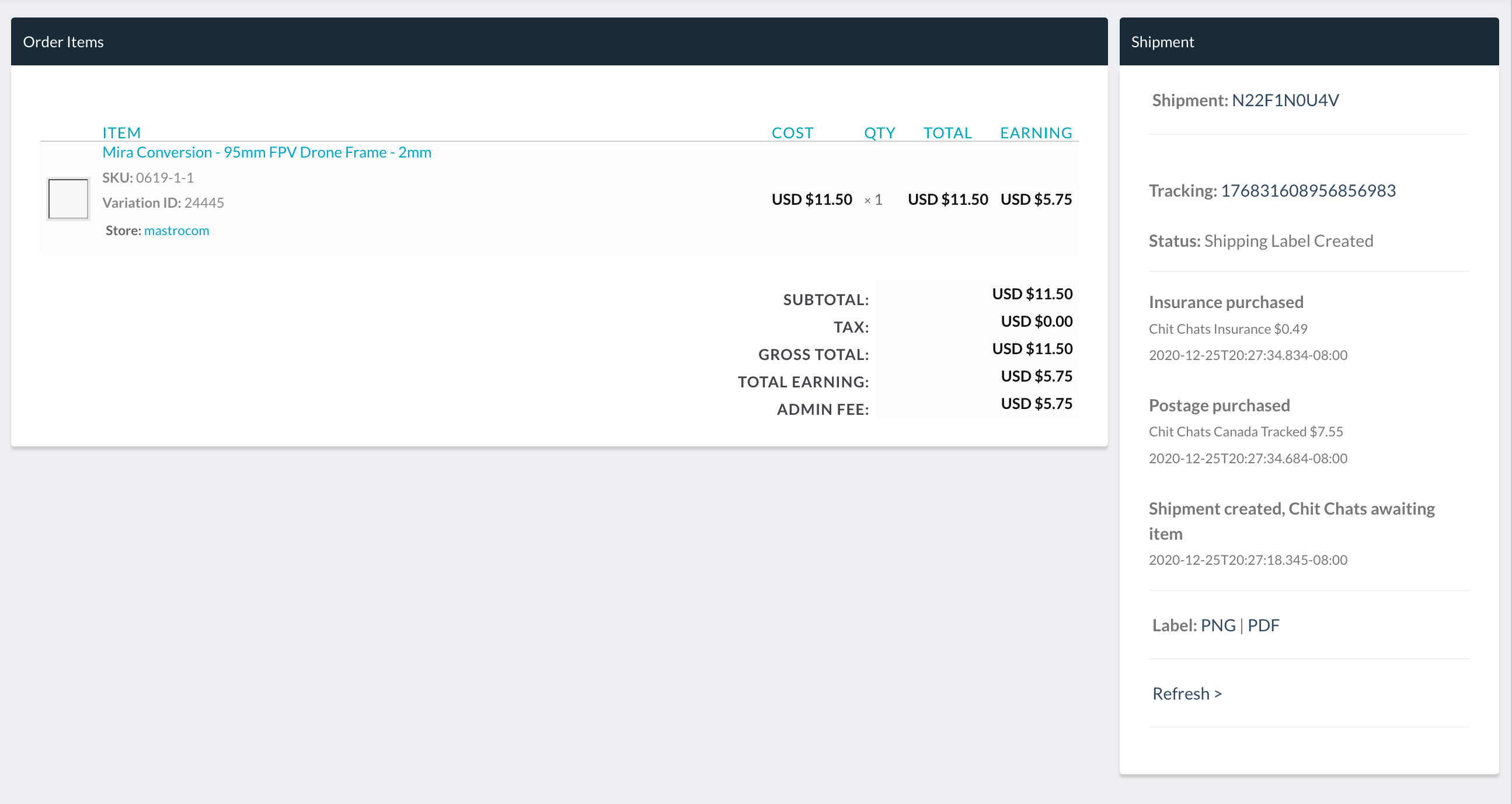 3. After purchasing a label, vendor will be presented with a link to a Shipping Label and tracking information
