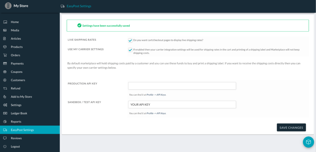 Vendors are able to specify their own integration (API) settings for a shipping carrier used by Marketplace for live shipping rates in the cart/checkout pages and printing of shipping labels.