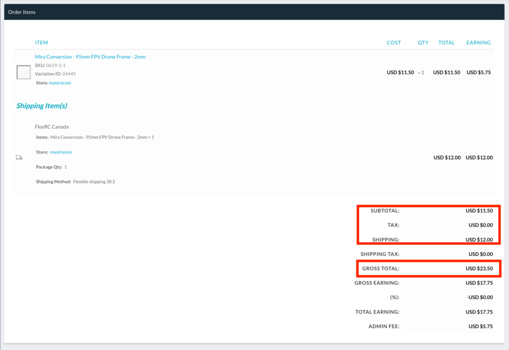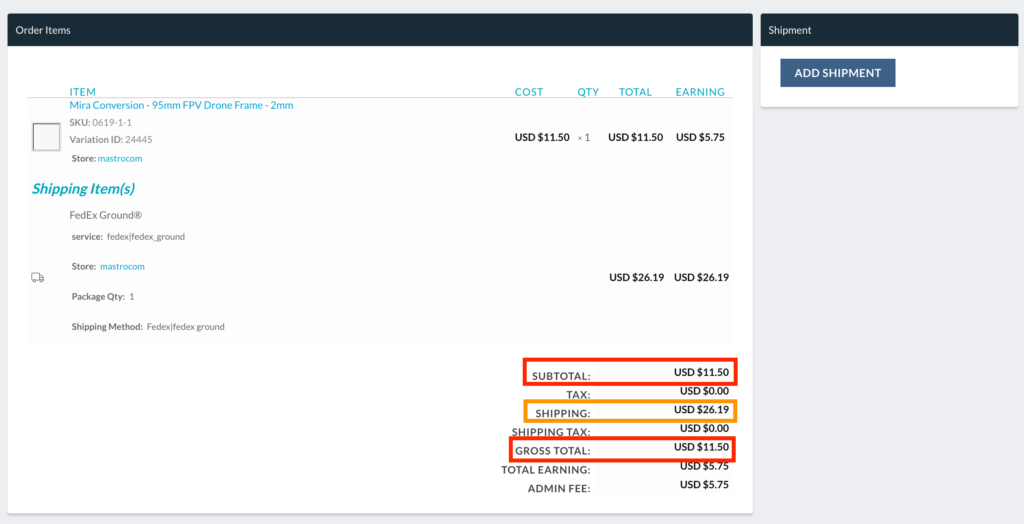 You will be able to see that such orders won’t transfer shipping cost to a vendor and their Subtotal will be the same as Gross Total: